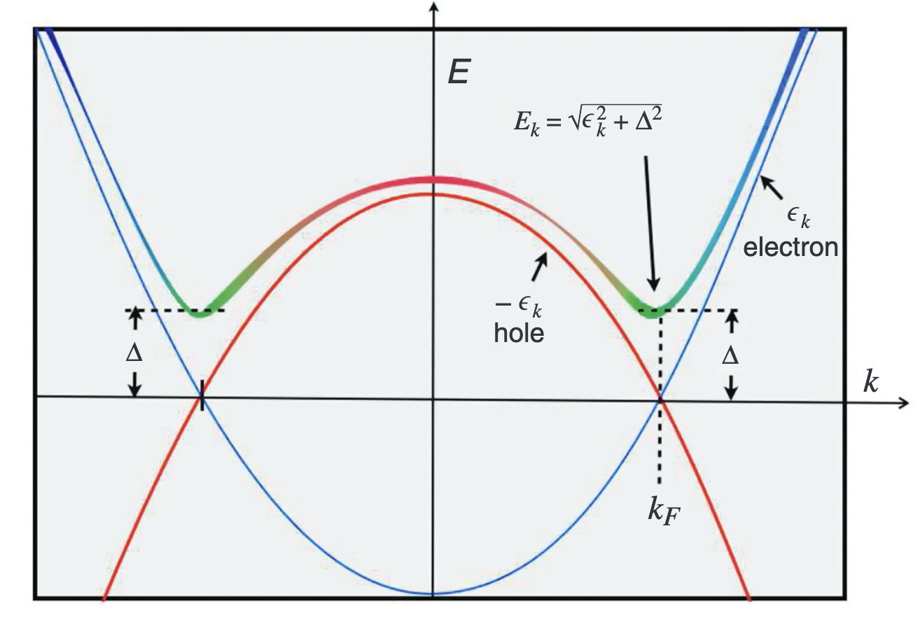 Starting from BdG Hamiltonian: \(H_{BdG}=\sum_{\mathbf{k}}\Psi_{\mathbf{k}}^{\dagger}\begin{pmatrix}\xi_{\mathbf{k}}&\Delta_{\mathbf{k}}\\\Delta_{\mathbf{k}}^{*}&-\xi_{\mathbf{k}}\end{pmatrix}\Psi_{\mathbf{k}}\) Assume the scattering occurs between two hot spots $\mathbf{k}1$ and $\mathbf{k}_2$ under the same ergodic surface. $\varepsilon_k=0$, which is based on the small pairing energy gap and a flat band corresponding to the large DOS. And we focused on the sign-changing scattering: $\Delta{\mathbf{k}1}=\Delta_0,\Delta{\mathbf{k}2}=-\Delta_0$. When there is no impurities, the eigenfunction $H\phi=\Delta_0\phi$ gives: \(\begin{align} \mathbf{k}_1:&\begin{pmatrix}0&\Delta_0\\\Delta_0&0\end{pmatrix}\begin{pmatrix}u_1\\v_1\end{pmatrix}=\Delta_0\begin{pmatrix}u_1\\v_1\end{pmatrix}\Longrightarrow u_1=v_1\\ \mathbf{k}_2:&\begin{pmatrix}0&&-\Delta_0\\-\Delta_0&&0\end{pmatrix}\begin{pmatrix}u_2\\v_2\end{pmatrix}=\Delta_0\begin{pmatrix}u_2\\v_2\end{pmatrix}\mathrm{~}\Longrightarrow\mathrm{~}-\Delta_0v_2=\Delta_0u_2\mathrm{~}\Longrightarrow\mathrm{~}u_2=-v_2 \end{align}\) For a scalar impurity potential inducing the scattering, the potential can be expressed as $\equiv V\tau{z}$. Projecting into the subspace spanned by ${\phi_1,\phi_2}$: \(M_{12}=\langle\phi_1|V\tau_z|\phi_2\rangle=\frac{V}{2}\begin{pmatrix}1&1\end{pmatrix}\begin{pmatrix}1&0\\0&-1\end{pmatrix}\begin{pmatrix}1\\-1\end{pmatrix}=\frac{V}{2}\begin{pmatrix}1&1\end{pmatrix}\begin{pmatrix}1\\1\end{pmatrix}=V=M_{21}\)2 The full Hamiltonian is: \(H_{eff}=\begin{pmatrix}\Delta_0&V\\V&\Delta_0\end{pmatrix}\Rightarrow E_\pm=\Delta_0\pm V\) The eigenvectors are the symmetric and asymmetrc composition of ${\phi_1,\phi_2}$: \(\begin{align} \Psi_{L}(\mathbf{r})&=\frac{1}{\sqrt{2}}[\phi_{1}(\mathbf{r})+\phi_{2}(\mathbf{r})]=\frac{1}{2}\left[\begin{pmatrix}1\\1\end{pmatrix}e^{i\mathbf{k}_{1}\cdot\mathbf{r}}+\begin{pmatrix}1\\-1\end{pmatrix}e^{i\mathbf{k}_{2}\cdot\mathbf{r}}\right]\\ &u_L(\mathbf{r})=\frac{1}{2}(e^{i\mathbf{k}_1\cdot\mathbf{r}}+e^{i\mathbf{k}_2\cdot\mathbf{r}}),v_L(\mathbf{r})=\frac{1}{2}(e^{i\mathbf{k}_1\cdot\mathbf{r}}-e^{i\mathbf{k}_2\cdot\mathbf{r}})\\ \Psi_{S}(\mathbf{r})&=\frac{1}{\sqrt{2}}[\phi_{1}(\mathbf{r})-\phi_{2}(\mathbf{r})]=\frac{1}{2}\left[\begin{pmatrix}1\\1\end{pmatrix}e^{i\mathbf{k}_{1}\cdot\mathbf{r}}-\begin{pmatrix}1\\-1\end{pmatrix}e^{i\mathbf{k}_{2}\cdot\mathbf{r}}\right]\\ &u_S(\mathbf{r})=\frac{1}{2}(e^{i\mathbf{k}_1\cdot\mathbf{r}}-e^{i\mathbf{k}_2\cdot\mathbf{r}}),v_S(\mathbf{r})=\frac{1}{2}(e^{i\mathbf{k}_1\cdot\mathbf{r}}+e^{i\mathbf{k}_2\cdot\mathbf{r}}) \end{align}\) In negative bias, the wavefunction is contributed by the electronic component: \(\begin{align} -\Delta_L: P_{-\Delta_L}^e=|u|^2\propto|1+e^{-i\mathbf{q}\cdot\mathbf{r}}|^2\propto1+\cos(\mathbf{q}\cdot\mathbf{r})\\ -\Delta_S: P_{-\Delta_S}^e=|u|^2\propto|1-e^{-i\mathbf{q}\cdot\mathbf{r}}|^2\propto1-\cos(\mathbf{q}\cdot\mathbf{r}) \end{align}\) Positive bias: \(\begin{align} \Delta_L: P_{\Delta_L}^h=|v|^2\propto1-\cos(\mathbf{q}\cdot\mathbf{r})\\ \Delta_S: P_{\Delta_S}^h=|v|^2\propto1+\cos(\mathbf{q}\cdot\mathbf{r}) \end{align}\) The LDOS is: \(L(E+\Delta_{L})+[1-\cos(\mathbf{q}\cdot\mathbf{r})]L(E+\Delta_{S})+[1-\cos(\mathbf{q}\cdot\mathbf{r})]L(E-\Delta_L)+[1+\cos(\mathbf{q}\cdot\mathbf{r})]L(E-\Delta_S)\)