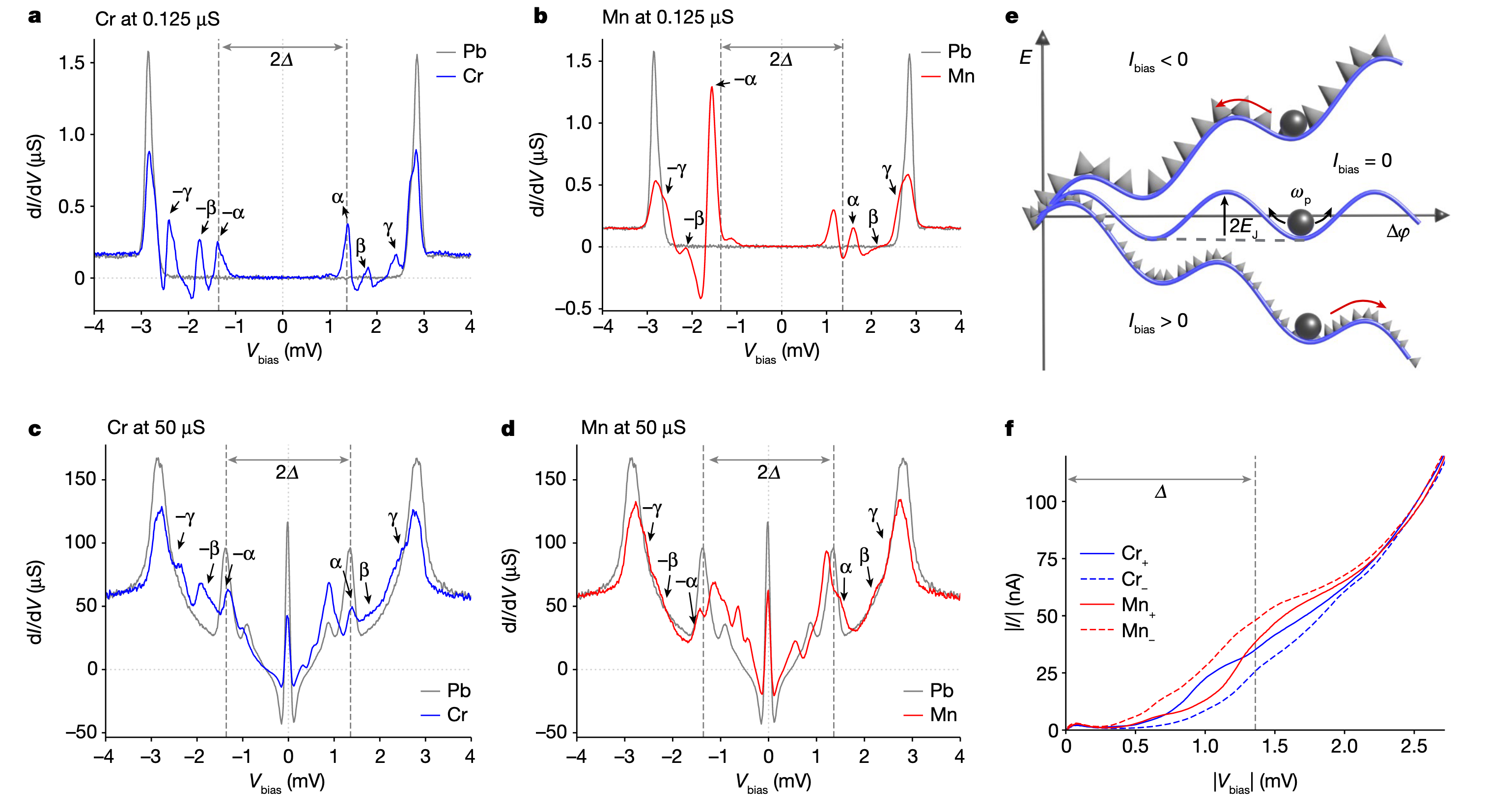 They then conduct the voltage-bias analysis. In low conductance regime (single quasi-particle tunneling regime) they identify Yu-Shiba-Rusinov state from the in-gap peaks ( in 50$\mu$S conductance, the in-gap peaks smear.). YSR state orginates from the magnetic impurities scatters the cooper-pair and breaks the pairing, can be obtained from the Anderson impurtiy model. The interacting Hamiltonian is: \(H_{\mathrm{int}}=\sum_{\mathbf{k},\mathbf{k}^{\prime}}\sum_{\sigma,\sigma^{\prime}}\psi_{\mathbf{k},\sigma}^{\dagger}[J\mathbf{S}\cdot\mathbf{s}_{\sigma,\sigma^{\prime}}+K\delta_{\sigma,\sigma^{\prime}}]\psi_{\mathbf{k}^{\prime},\sigma^{\prime}}.\) where $J=|t|^2\left{\frac{1}{|\epsilon|}+\frac{1}{\epsilon+U}\right},K=|t|^2\left{\frac{1}{|\epsilon|}-\frac{1}{\epsilon+U}\right}.$ A standard calculation can show that non-zero $K$ can induce the particle-hole asymmetry.