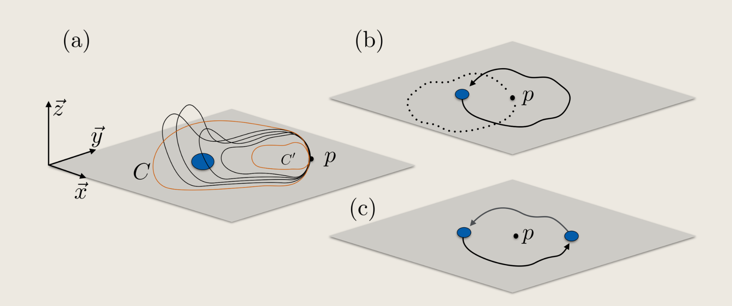 In 3-dimensional space, any closed path $C$ is topologically equivalent to a single point, whether it includes a particle or not. This means that the path can be continuously deformed to a point without breaking. Recall that if we exchange two identical particles like c-part in Fig. 9, the operation is equivalent to a closed loop of one of them. The rotation of the reference point $p$ around the particle is equivalent to a closed loop of the particle around the reference point. So the exchange of two identical particles is topologically equivalent to the origin. However, in 2-dimensional space, the continuous deformation of a closed path to a point is interrupted by the particle’s existence. Describing such a system requires a nontrivial phase factor, which generally may take any value $\theta\in\left[0,2\pi\right]$.