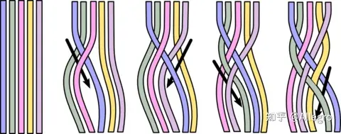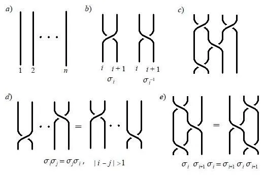 \(\sigma_i\) is an operation which connects \(i\)th end to \(i+1\)th end, and the string start from \(i\)th end is beneath the string from \(i+1\)th. Just like anyons, the operation which makes the string travel across the string is topologically in-equilibrium to the previous, which is denoted as \(\sigma_i^{-1}\).