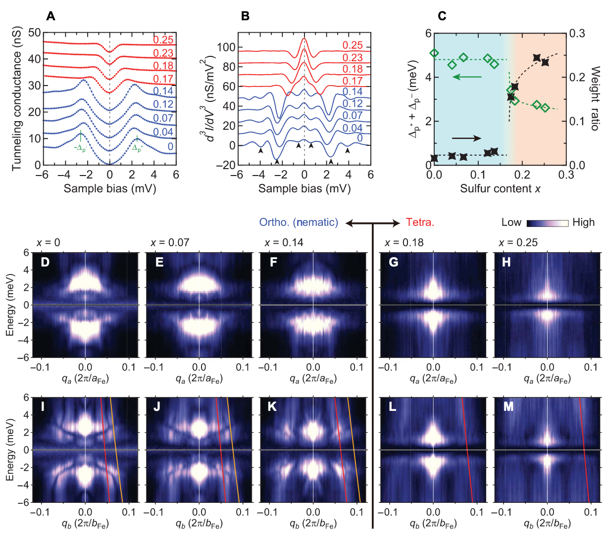 $x<0.17$, the phase is called nematicity phase, which is anisotropic. In this phase, the electronically driven nematic phase causes the lifting degeneracy between $d_{xz}$ and $d_{yz}$ orbitals. The orbital order rearanges the electrons and enhances the pairing respectively, leading to 3 gaps: $\pm0.6$meV (mainly electron-like d${xy}$ band), $\pm 2.5$meV (mainly hole-like $d{yz}$ band located at the hole band at $\Gamma$ point), and $\pm4.0$meV (mainly hole-like $d_{xz}$ band). It has reported that an extra gap 1.3meV at M point, contributed by an electon band.