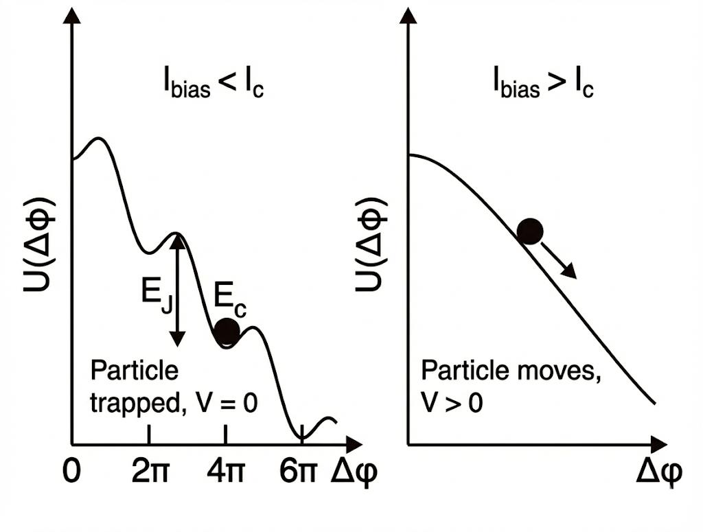 The full Hamiltonian describing the tunneling between tip and sample, including Capacitance, Josephson coupling, external current/bias, and the environment is: \(H_{\mathrm{total}}=\frac{\widehat{Q}^2}{2C}-E_J\cos\widehat{\phi}-\frac{\hbar I_{\mathrm{bias}}}{2e}\widehat{\phi}+Thermal+Env\label{eq:phaseH}\) It can be viewed as a particle $\phi$ with momentum $Q$ moving in a tilting wavy potential well. Starting from the phase-locked situations, applying for the typical SIS cases. In this case, the particle has low kinetic energy $E_C$, negligible compared to the ‘depth of well’ $E_J$. So when the ‘tilting’ $I_{bias}$ is not large enough, the particle is trapped in the bottom of the well, determining the voltage drop $V = \frac{\hbar}{2d}\dot\phi$ is zero. This reveals the reason why we observe the current at zero-bias in SIS Josephson junctions. When $I> I_C$, the potential well is disrupted $\dot V<=0$, so the I-V relationship back to normal. The discription can be viewed in the graph 1.